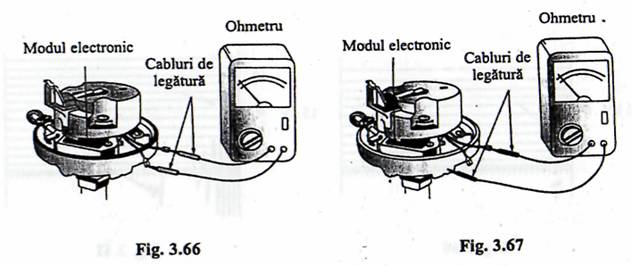 Verificarea bobinei generatorului de impulsuri. Se au in vedere verificarile pentru scurtcircuit si pentru intreruperi. Pentru aceasta se indeparteaza capacul distribuitorului si se extrag cablurile de legatura ale bobinei generatorului cu modulul electronic al aprinderii, la care se cupleaza un ohmetru (fig. 3.66). Valoarea normala a rezistentei se incadreaza in general in limitele 650 850 ohmi. Indicatia 'infinit' a aparatului de masura semnifica o intrerupere a infasurarii bobinei, iar valori inferioare vor semnala un scurtcircuit intre spire sau la masa.
