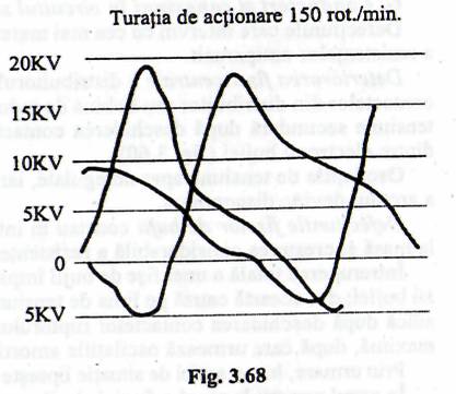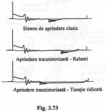 In figura 3.73 sunt prezentate comparativ curbele tensiunilor din circuitul secundar pentru un sistem de aprindere clasic, cu ruptor mecanic si cele ale unui sistem de aprindere cu generator inductiv de impulsuri functionand la doua turatii net diferite.