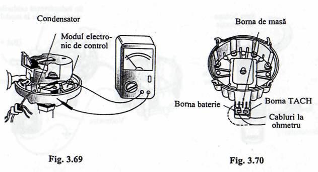 Verificarea infasurarii primare a bobinei de inductie. Avand contactul aprinderii deschis, se cupleaza ohmmetrul la bornele <TACH> si <BATTERY> pentru a masura rezistenta infasurarii primare a bobinei de inductie (fig. 3.69); in mod normal, aceasta trebuie sa fie de minim 0,5W. O valoare inferioara acestei limite semnaleaza un scurtcircuit intre spirele infasurarii. in cazul inregistrarii valorii infinit, infasurarea primara este intrerupta.