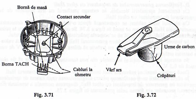 Cu ocazia acestor masuratori se va verifica starea capacului distribuitorului. Acesta nu trebuie sa prezinte fisuri, contactele sale nu trebuie sa fie oxidate sau uzate excesiv, iar contactul rotitor nu trebuie sa prezinte urme de ardere, acestea indicand scurgeri parazite de curent (fig. 3.72).