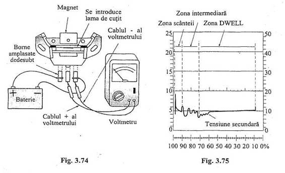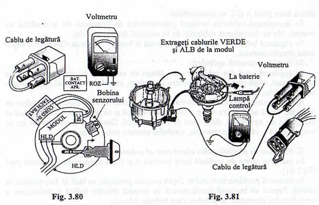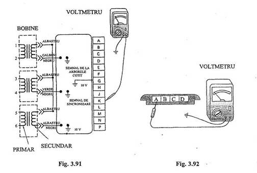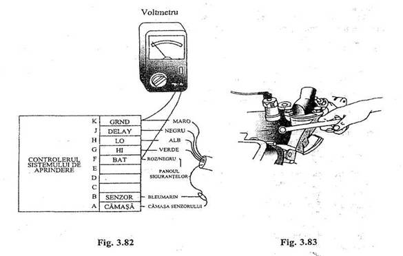 Cu conectorul controlerului electronic al scanteii la locul sau, se cupleaza borna - a voltmetrului la borna K (fig. 3.82).