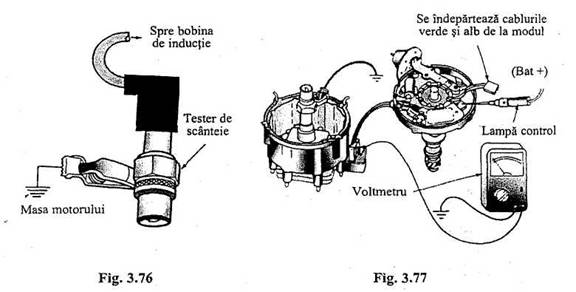 Pentru aceasta verificare se va utiliza un voltmetru, o lampa de control de 12 V si un minitester de scanteie. Acesta din urma este de fapt o bujie cu electrozii usor modificati (fig. 3.76), capabila, in conditii atmosferice normale, sa formeze o scanteie la tensiuni de aproximativ 25 kV.