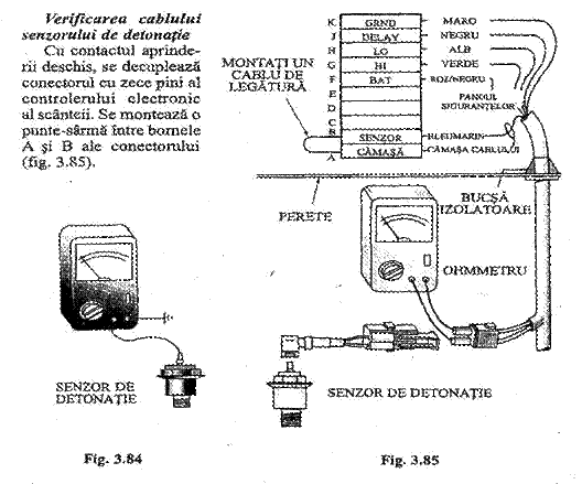 Se conecteaza borna - a ohmetrului la masa, iar borna + la borna centrala a senzorului de detonatie (fig. 3.84).