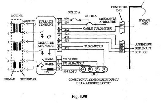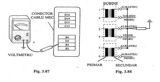 Se cupleaza unul din cablurile lampei de control la masa. Se inchide contactul aprinderii si se pune in contact celalalt fir al lampii de control la cablul albastru de alimentare, care este comun tuturor bobinelor de inductie (fig. 3.88).