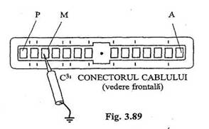 Se cupleaza celalalt cablu al lampii de control la borna M a conectorului (fig. 3.89). Daca lampa nu se aprinde, se va verifica siguranta fuzibila de 25A a modulului electronic de control, precum si o eventuala intrerupere a cablului care ajunge la borna M. (fig. 3.90)