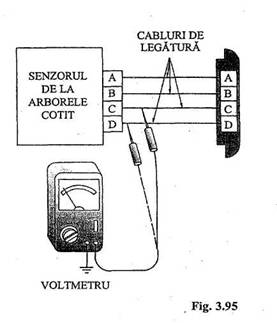 Cu contactul aprinderii deschis se demonteaza senzorul si se decupleaza de la el conectorul cu patru pini. intre senzor si conector se face legatura cu patru conductori, potrivit schemei din fig.3.95.