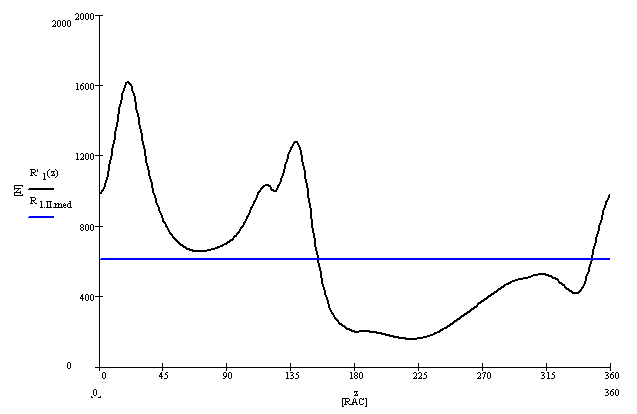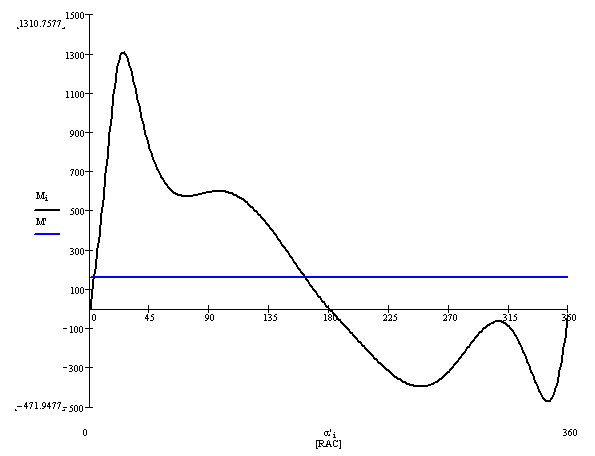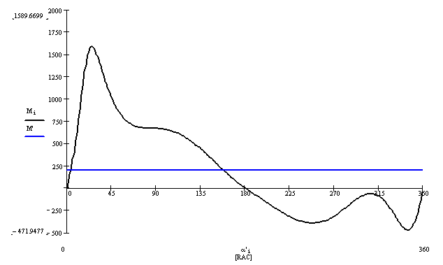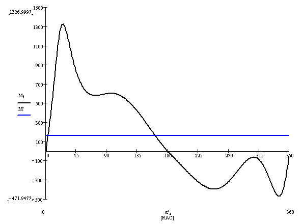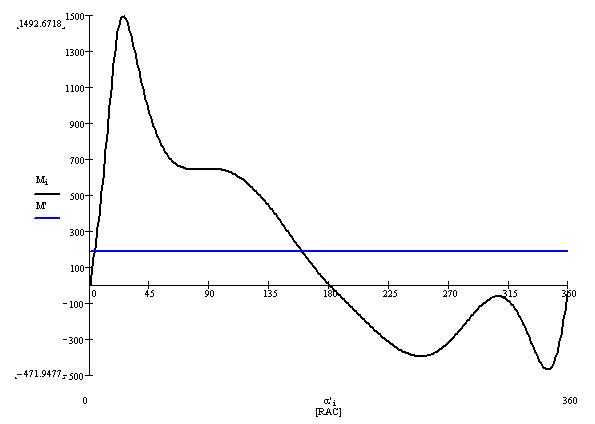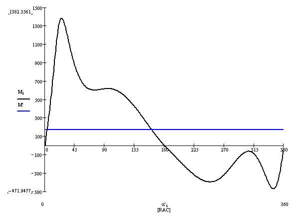 Figura 3.2.e Variația cu unghiul de manivelă a momentului motor din mecanismul monocilindric aferent motorului naval.