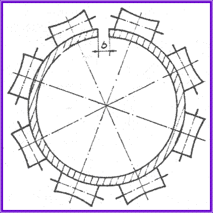 v deplasarea axiala a cadrului M si a rolelor periferice Re evita variatiile deschiderii b a rostului, cauzata de abaterile de la circularitatea conductei.