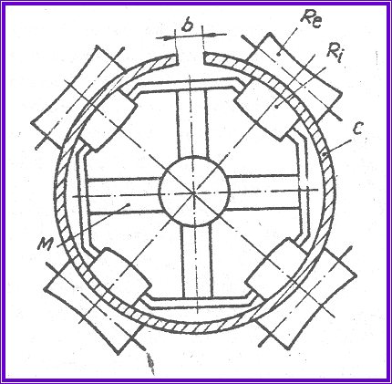 v în acest scop, actioneaza doua perechi de role, exterioare - Re, si interioare - Ri, montate pe un cadru metalic M;