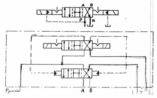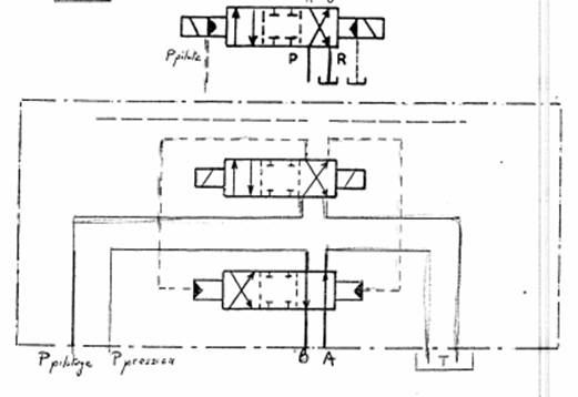 Pe valva hidraulica principala este montata electrovalva pilotata. Camerele de pilotare sunt unite cu orificiile de iesire a1 si a2 a electrovalvei.