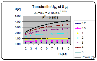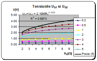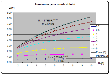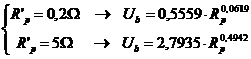 Din figura 4 se observa ca tensiunea ecranului Ub depinde in mare masura de rezistentele prizelor de pamant Rp (din fiecare statie electrica de la capetele liniei), dar si de rezistenta prizei de pamant R’p din locul mansonului realizat la mijlocul cablului. Pentru acest caz s-au dedus doua regresii analitice de tip putere pentru doua situatii: