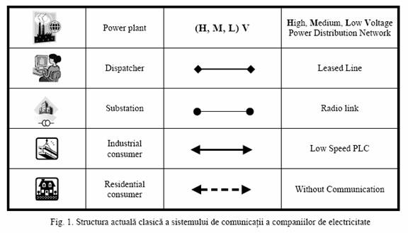 O diagrama a sistemului actual de comunicatii utilizat de companiile de distributie a energiei electrice este prezentata în Figura 1. Majoritatea legaturilor sunt pe linii închiriate si sisteme PLC de mica viteza.