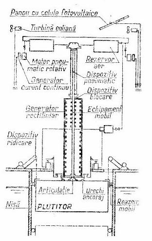 Solutia prezentata impune realizarea unui structuri plutitoare, cat mai stabila in masa agitata a valurilor, capabila sa sustina echipamentul energetic proiectat dupa principiul de functionare descries. O caracteristica deosebita o constituie posibilitatea nelimitata de dezvoltare pe verticala a instalatilor, precum si capacitatea elementelor de captare de a prelua valuri neregulate, cu inaltimea cuprinse intre 5 cm si 9 m.