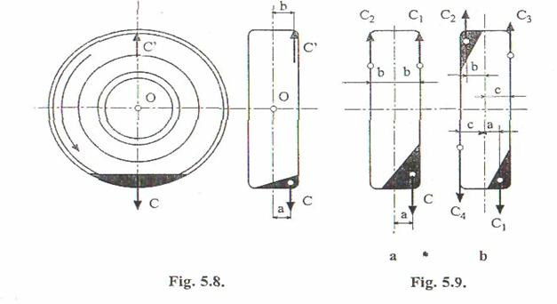 La rotile cu jante late, echilibrarea cu o singura contragreutate nu duce la rezultate satisfacatoare, fapt care impune plasarea a doua contragreutati aditionale, cate una pe fiecare flanc al jantei (fig. 5.9). Si intr-un caz si intr-altul se cere respectarea celor doua conditii fundamentale enuntate: