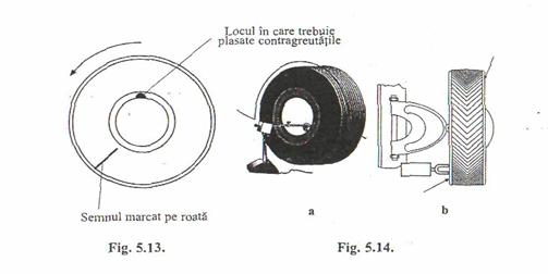 In aceasta situatie lampa stroboscopica va ilumina roata in pozitia in care masa neechilibrata se afla in partea de jos iar un observator va vedea roata in stare imobila cu semnul dispus intr-o pozitie oarecare (fig. 5.13). Se franeaza roata pana la oprire si se aseaza cu semnul in pozitia in care a fost remarcat in timpul incercarii, cand se facea iluminarea cu lampa stroboscopica. Acum masa neechilibrata se afla in partea de jos a rotii, deci locul in care trebuie plasata contragreutatea de echilibru este plasat diametral opus, adica in partea de sus a jantei, asa cum se arata in figura 5.13.