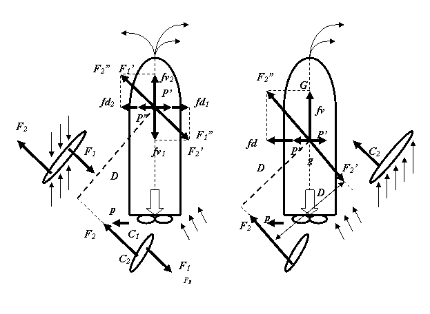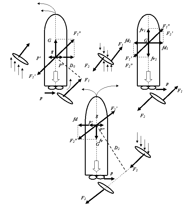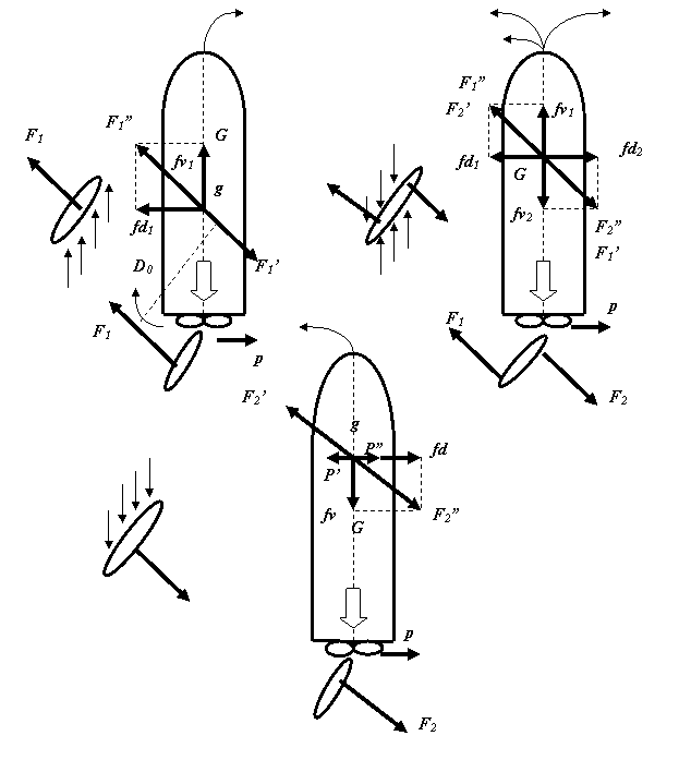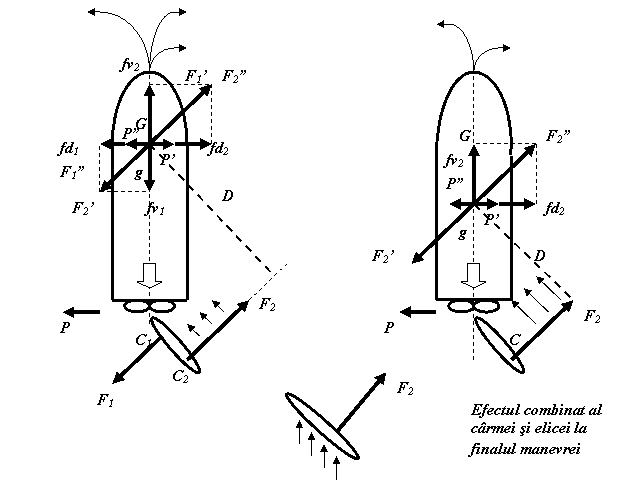 Fig. 4.27. Nava merge înainte, masina înapoi, cârma dreapta: efectul combinat al cârmei si elicei F1 si F2 au devenit egale