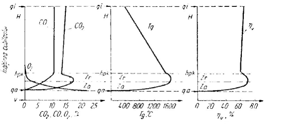 Fig.2. Caracterizarea zonelor cubiloului, prin intermediul compozitiei gazelor (a), temperaturii gazelor (b) si coeficientului de ardere (c).