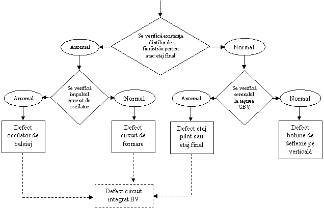 Pentru rezolvarea acestei probleme este mai operativa metoda examinarii vizuale a starii circuitului sau componentelor si cea a urmaririi semnalului cu ajutorul osciloscopului (verificare statica în c.a.). Succesiunea acestor verificari este ilustrata în figura 2,