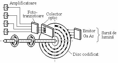 Majoritatea traductoarelor numerice absolute se bazeaza pe principii optice si conversie fotoelectrica. Discul optic codat este realizat din sticla speciala pe care sunt trasate spatii (fante) transparente si opace. La disc se asociaz 232h77c 59; o sursa de lumina - cuplata cu un sistem optic si o matrice de fotoelemente dispuse radial, ca īn figura 4.35.