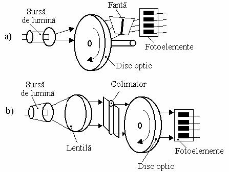 Īn figura 4.36-a, sistemul bec-lentila ilumineaza o fata a discului, iar senzorii (fotoelementele) sunt dispusi īn dreptul unei fante, pe linia de citire.