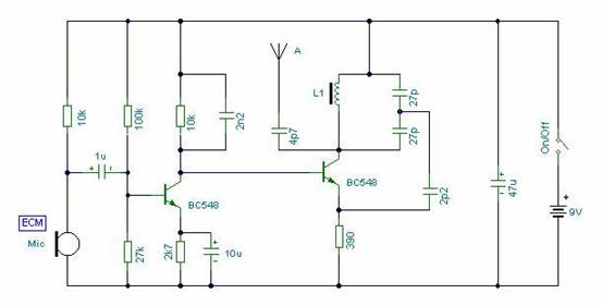 I have used a pair of BC548 transistors in this circuit. Although not strictly RF transistors, they still give good results. I have used an ECM Mic insert from Maplin Electronics, order code FS43W. It is a two terminal ECM, but ordinary dynamic mic inserts can also be used, simply omit the front 10k resistor.