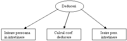 Pentru fiecare angajat se calculeaza in functie de persoanele aflate in intretinerea sa un coeficient de deducere; pentru fiecare persoana in intretinere se mai adauga 0.5 la coeficientul de deducere, care este initial 1; daca persoana respectiva este invalida se adauga 1, in loc de 0.5; acest coeficient se inmulteste cu deducerea de baza si se afla deducerea totala;