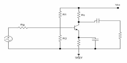 AV=V01/Vg=[I(Rc||RL)] / [[(RB||Ri,T+Rg)/(RB||Ri,T)][Vbe+RF(Vbe/rp -I)]] (1)