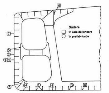 În figura 4.4. se prezinta o sectiune schematizata printr-un vapor, figura în care sunt prezentate posibilitatile de înlocuire a diferitelor procedee de sudare cu altele partial sau total mecanizate. În aceasta privinta, procedeele de sudare cu gaz protector se îndreapta în primul rând spre cele cu sârma tubulara sau cu mai multe sârme pline. Acestea se utilizeaza în special la constructia bloc-sectiilor, unde s-au impus pe plan mondial, dar se folosesc si la sudarea altor structuri interioare sau exterioare ale navelor.