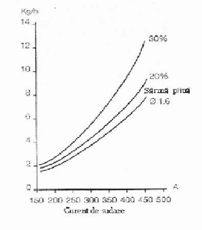 Figura 4.5. Randamentul de depunere a doua tipuri de sârme tubulare, cu coeficient de umplere diferit, comparativ cu o sârma plina