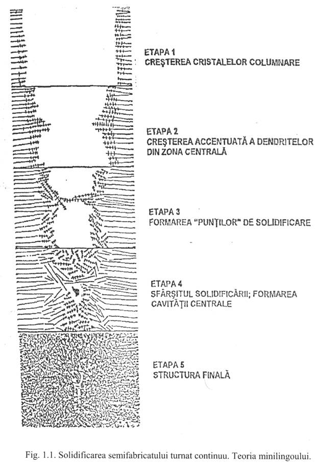 In partea superioara a firului turnat continuu in cristalizator se formeaza crusta ( etapa 1 ) dupa care cristalele columnare incep sa creasca perpendicular pe suprafata semifabricatului ( etapa 2 ) . Datorita curentilor de convectie si a gradientilor termici din otelul lichid dezvoltarea cristalelor columnare devine instabila, creand astfel posibilitatea formarii puntilor ( etapa 3 ) care izoleaza de restul otelului lichid anumite zone nesolidificate. Solidificarea in aceste zone este asemanatoare cu solidificarea in lingotiera – teoria minilingoului. Otelul lichid prezent in aceste zone se va solidifica formand microcalitati ( etapa 4 ), structura finala de solidificare fiind reprezentata conform fig. 1.1. ( etapa 5 ).