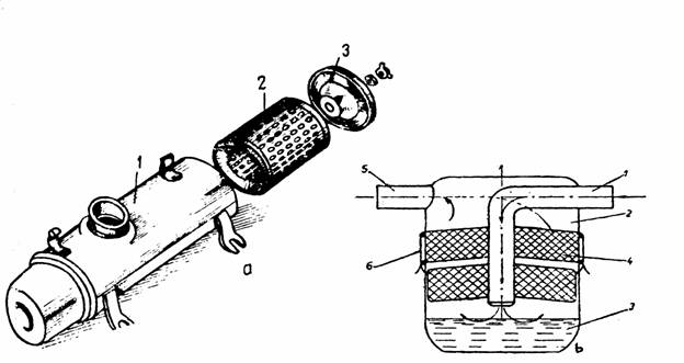 - Filtrul combinat 2 (fig.7), folosit la motoarele D 797-05 si D 2156 HMN 8, face ca aerul ce intra prin racordul 1 sa treaca peste uleiul din carcasa inferioara 3, fixata prin clemele 6, unde sunt retinute particulele de praf grosiere, apoi prin elemen-tul filtrant cu sita 4, unde sunt retinute pe lānga restul impuritatilor din aer si uleiul antrenat din carcasa si apoi prin racordul de iesire 5.