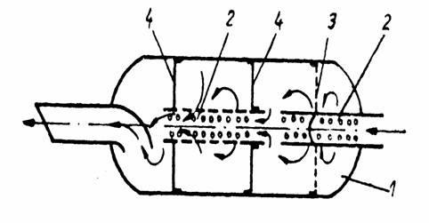 Amortizorul de zgomote (toba de esapament) 1 (fig.8) preia gazele arse din co-lector la evacuare (prin teava de legatura), amortizānd zgomotele, micsorānd presiunea si energia loc cinetica. Amortizorul de zgomote conduce gazele arse, venite din teava de esapament prin tuburile perforate 2, peretele despartitor perforat 3 si pe-retii despartitori neperforati 4, alternānd sectiunea mica cu cea mare, reducānd zgomo-tele de evacuare. Unele tobe functioneaza pe principiul filtrelor acustice.