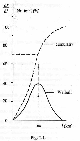 De exemplu, se presupune un parc a carui curba de distributie in functie de rulajul l este reprezentata de linia continua din fig.1.4, limitata de rulajele minim lmin si maxim lmax; deoarece 'variatia parcursului este mare, parcul se imparte in trei grupe precizate de rulajele intermediare l' si l', obtinandu-se astfel trei submultimi de obiecte limitate de intervalele de rulaj l'- lmin ,l'-l' si lmax -l', in interiorul carora se vor putea construi curbele de distributie particulare I, II si III cu parametrii respectivi. Acestora li se va aplica tratamentul descris anterior, determinandu-se trei perioade optime ld1,, ld2 si ld3