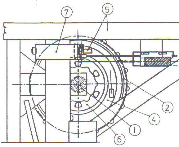 Frana de siguranta este realizata ca un disc de frana inelar si este amplasat in roata duplex a lantului (2) . Ea este intotdeauna instalata in tandem cu monitorul de viteza si cu contactul de rupere lant de pe lantul de actiona 424e46e re . Discul franei (4) care este prevazut cu ferodou de frana (3) pe amandoua partile , este pivotat in roata duplex a lantului (2) .Patru blocuri de retinere (5) sunt dispuse in afara discului franei . Discul franei (4) este presat pe roata duplex (2) cu ajutorul unui disc (6) O inchizatoare tip clichet (7) care este pusa in miscare de un solenoid , este strans prinsa de grinda . In caz de pericol aceasta incuietoare blocheaza discul franei (4) Frana de siguranta functioneaza numai pentru directia in jos .