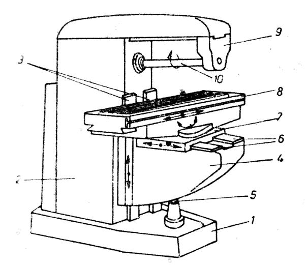 In lungul ghidajelor 6 se poate misca sania 7, iar pe aceasta din urma, sania cu masa de lucru 8. Masa de lucru poate executa deci, miscari pe trei directii perpendiculare una pe alta, de asemenea mai poate fi si rotita in plan orizontal. Miscarea principala o executa arborele 10 pe care se monteaza freza.