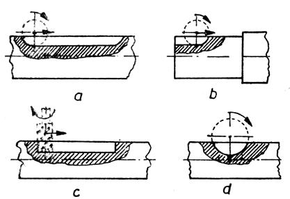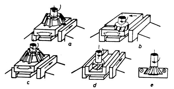 Frezarea suprafetelor profilate poate fi efectuata pe masini de frezat cu consola. De regula asemenea suprafete se realizeaza prin folosirea unor scule profilate sau prin copiere. Frezarea suprafetelor circulare se realizeaza cu folosirea platoului rotativ. Se pot executa astfel, canale circulare, suprafete cilindrice sau tronconice. Frezarea canalelor de pana se face utilizand freze disc sau deget. Cele patru cazuri de canale de pana prezentate in figura 2.61 se executa in urmatoarele conditii: a, b si d cu freza disc; c cu freza deget. Cazurile a, b si d se executa pe o masina de frezat orizontala, iar cazul c pe o masina de frezat verticala.