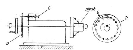 Capetele divizoare pot fi cu discuri, cu roti dintate sau optice. Capul divizor simplu este destinat lucrarilor de serie care prezinta un numar redus de divizari. El se compune dintr-un corp care sustine arborele principal (fig. 2.63). Pe unul din capetele acestui arbore se afla montat discul divizor D si o roata de antrenare, iar pe celalalt capat dispozitivul de prindere a piesei.