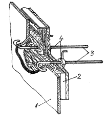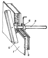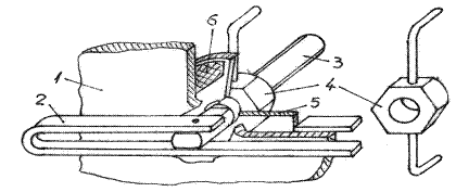1- corpul navei; 2 - bulon filetat; 3 - piulita; 4 - cap pivotant ce permite rotirea cu 90° pentru a putea fi introdus pe gaura; 5 - material izolant (garnitura); 6 - distantier.