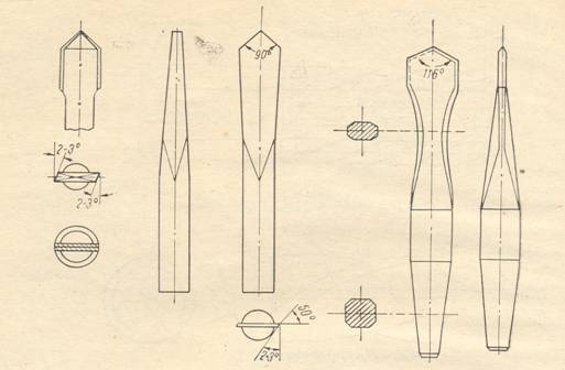 Burghiele late (fig. 3) au o constructie mai rezistenta si sint utilizate in general la burghierea tablelor subtiri suprapuse. Muchiile aschietoare ale burghiului lat sint dispuse simetric fata de axa burghiului, iar unghiul dintre ele este de 90116°.
