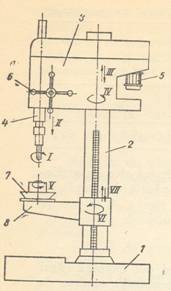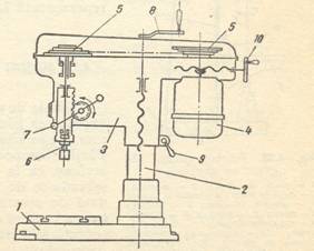 In figura 10 este reprezentata schema de principiu a unei masini de gaurit cu coloana. Ea se compune din placa de baza 1 in care este fixata coloana 2.