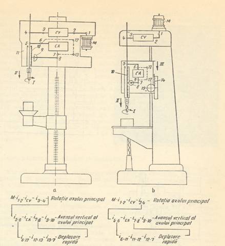 Aceste masini se utilizeaza din ce in ce mai mult in atelierele de reparatii. Schema cinematica de principiu a unei masini de gaurit cu coloana, este reprezentata in figura 12, a.