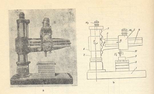 Masina de gaurit radiala (fig. 13) se compune dintr-o placa de baza 7 pe care este montata coloana 2. Bratul 3 prevazut cu ghidajele 4 pe care culiseaza capul de gaurit, 5 este solidar cu mansonul spintecat 6, ce se poate deplasa pe verticala fiind actionat de motorul M2 si surubul 7. Masina este prevazuta cu o masa 8 montata pe placa de baza ce serveste la prinderea semifabricatelor de dimensiuni relativ mici. Arborele principal 10, primeste miscarea de la motorul M1 prin intermediul cutiei de viteze ce se afla in interiorul capului de gaurit impreuna cu cutia de avans. Lantul cinematic al miscarii de avans II deriva de la lantul cinematic principal. In figura 13, c este reprezentata schema cinematica de principiu a unei masini de gaurit radial la care se disting urmatoarele miscari de rotatie I si avans II a arborelui principal; de potrivire III realizata manual prin deplasarea in lungul bratului, a capului de gaurit, de potrivire IV prin deplasarea pe verticala a bratului, de potrivire V in plan orizontal prin rotirea manuala a bratului.