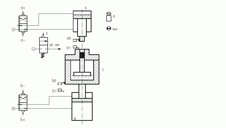 Pozitia de sus si de jos a poansonului si a matritei sunt controlate cu ajutorul captorilor de final de cursa (a0, a1, b0, b1)
