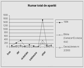 Se constata din graficele anterioare ca marcherii de prozodie/ideatie nu sunt doar destul de diferiti, ca frecventa de aparitie, de la un text la altul, de la un domeniu la altul, ci reprezinta, prin insasi aceasta diferentiere, un bun mod de depistare a domeniului din care face parte textul (presupus a nu fi clasificat, ca domeniu).