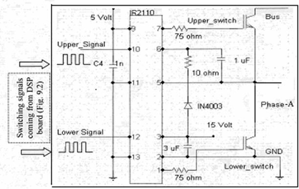 Schema de conectare, protectie si alimentare a driver-ului IR 2110 folosit in convertor c.c./c.a. în punte trifazata în tehnologie IGBT.