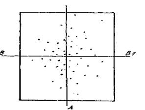 - cānd numarul de lovituri este mai mare, punctul mediu al loviturilor se determina dupa ce s-au trasat axele īmprastierii. Pe panoul cu punctele de incidenta se duce o linie verticala si una orizontala, astfel ca de ambele parti ale fiecarei linii sa se afle jumatate din punctele de incidenta. Punctul de intersectie a acestor axe este punctul mediu al loviturilor. Daca numarul loviturilor este fara sot, axele īmprastierii trebuie sa treaca prin unul din punctele de incidenta.