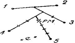 - pentru cinci lovituri: se gaseste punctul mediu al loviturilor pentru patru lovituri oarecare, asa cum s-a aratat mai sus si se uneste acest punct cu al cincilea punct de incidenta ; distanta īntre ele se īmparte īn cinci parti egale ; punctul de divizare cel mai apropiat de punctul mediu al loviturilor pentru patru lovituri va fi punctul mediu al loviturilor pentru cinci lovituri (fig. 4 "e") ;