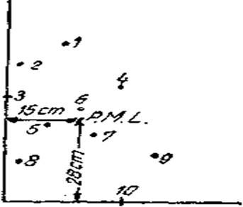 - prin ultimul punct de incidenta din stānga (dreapta) se trece o linie verticala (longitudinala) si se masoara distanta de la fiecare punct de incidenta pīna la aceasta linie ; suma valorilor rezultate din masuratorile efectuate se īmparte la numarul punctelor de incidenta ;