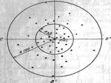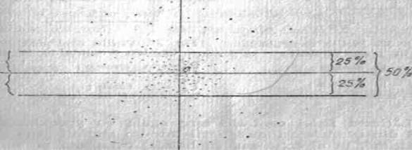 Dupa aceasta se traseaza cu compasul un cerc, avānd punctul mediu al loviturilor drept centrul cercului, care sa cuprinda 50% din numarul punctelor de incidenta sau 100%>, adica toate punctele de incidenta.