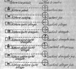De exemplu, atunci cānd ochitorul ocheste cu catarea subtire, pozitia ochiului fata de linia de ochire corecta este mai jos, iar acesta, pentru a suprapune linia de ochire luata cu punctul de ochire, va indica deplasarea indicatorului īn sus si invers, cānd ocheste cu catarea plina. Atunci cānd ochitorul ocheste cu catarea lipita dreapta (stānga) pozitia ochiului fata de linia de ochire corecta este la stānga (dreapta), iar acesta pentru a suprapune linia de ochire cu punctul de ochire va indica deplasarea indicatorului īn stānga (dreapta) (fig. 16).